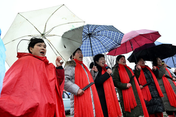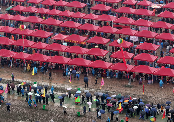 会场中间多出了一顶顶红色的遮雨棚,艺人们支起一张桌子、拉一把椅子,器乐声起,这就是他们的一方舞台。